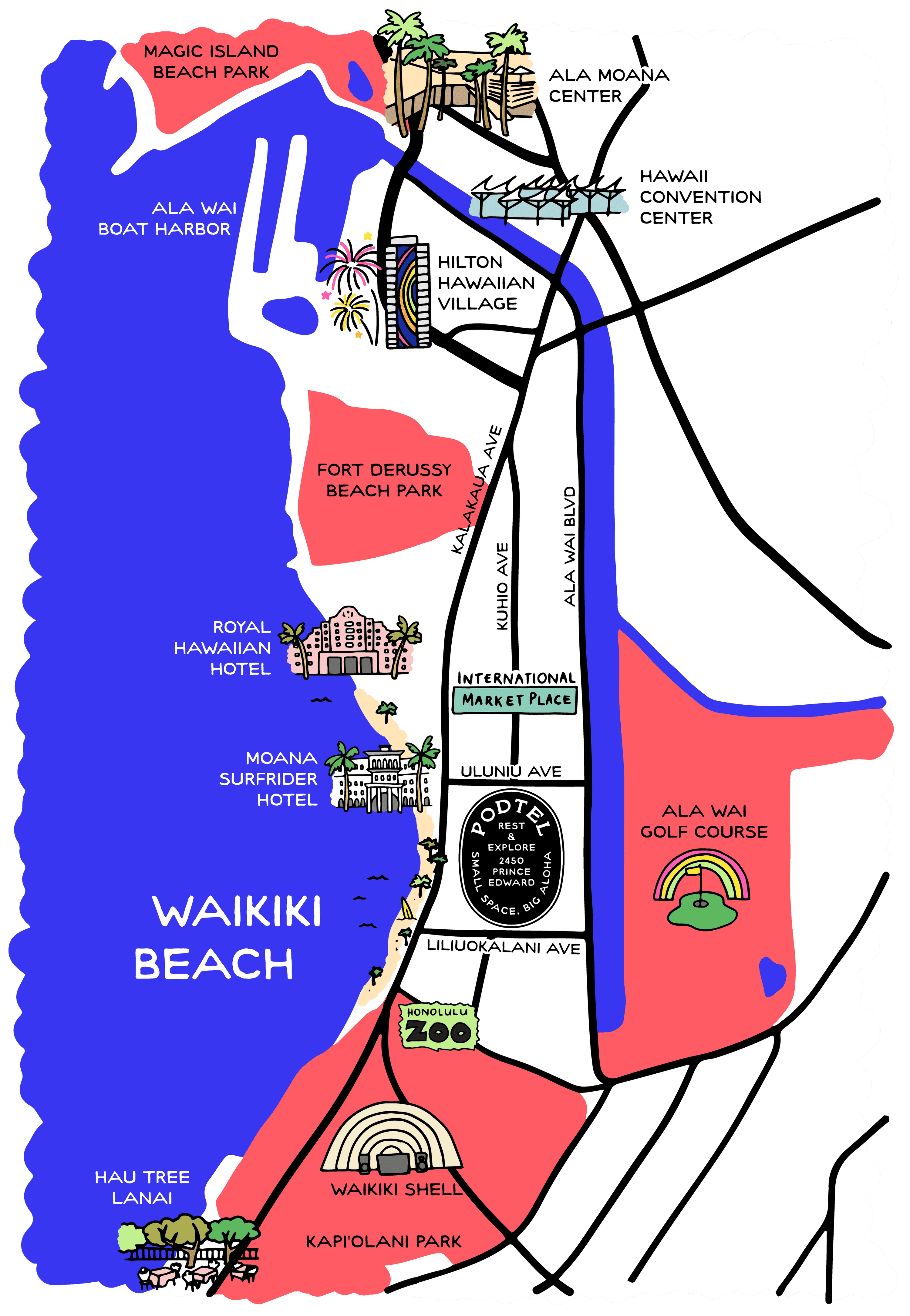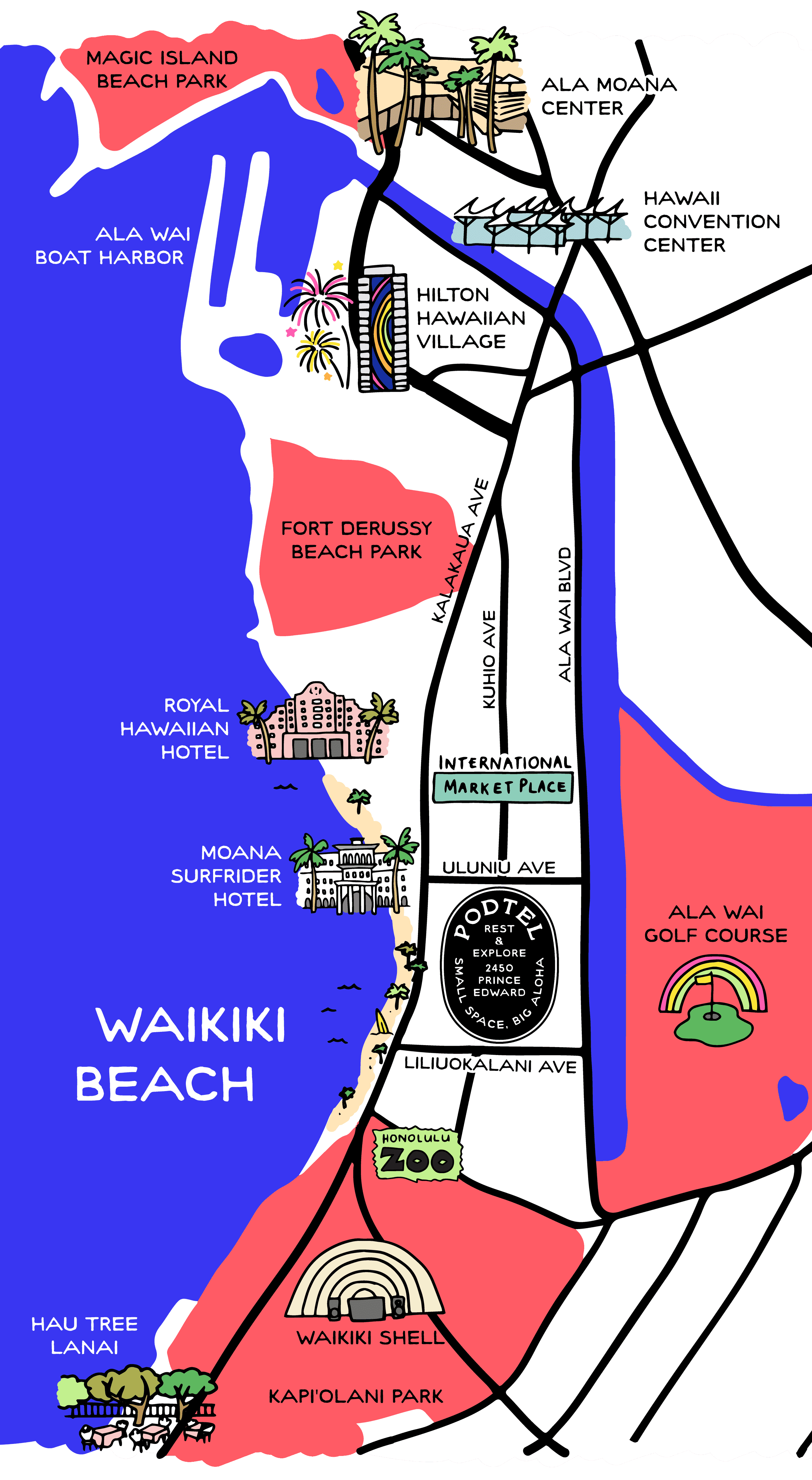 • Prime Location Nestled in Waikiki’s heart, Podtel lands you steps from Oahu’s top attractions—beach two blocks away, local shops, and nightlife within reach. Your gateway to the best awaits.