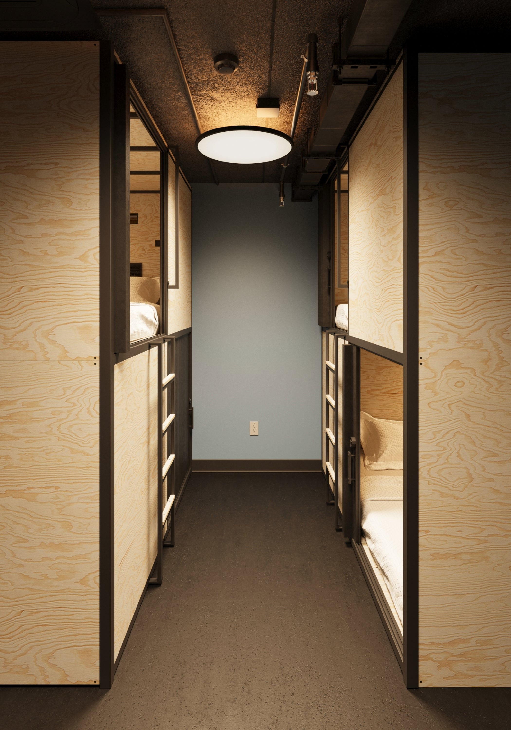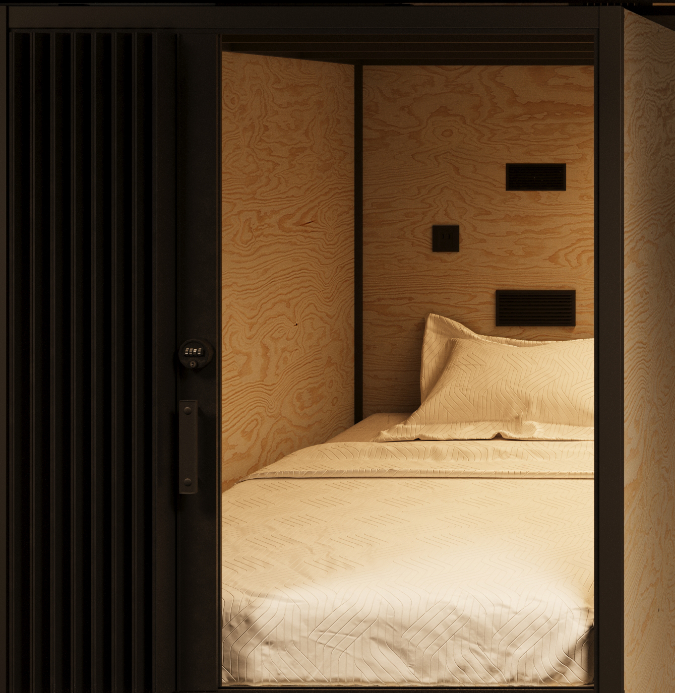 • You’ll receive a text with codes for the lobby, bathrooms, and your assigned sleeping level. The pod level and bathroom access code activates at 3 PM. Simply enter your code on the keypad.